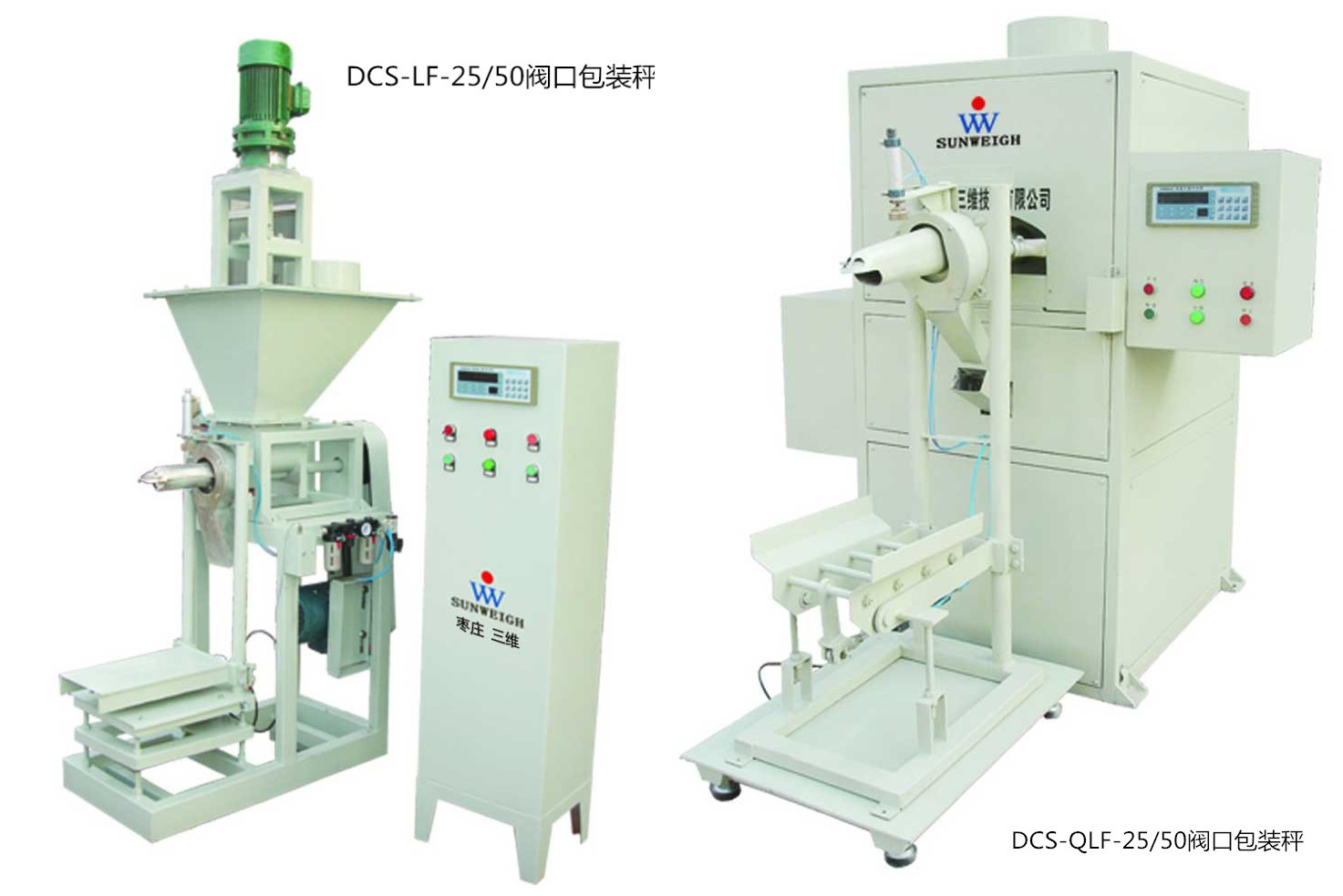 DCS-LF-25/50閥口包裝秤和DCS-QLF-25/50閥口包裝秤是棗莊三維生產(chǎn)的主打產(chǎn)品。閥口式定量包裝秤是集自動計量、灌裝、封包于一體,不需縫口機縫包的包裝機;并采用閥口式包裝工藝,減少了粉塵外溢;高速處理控制儀表及數(shù)字變頻技術(shù),確保了極高的計量準(zhǔn)確度。